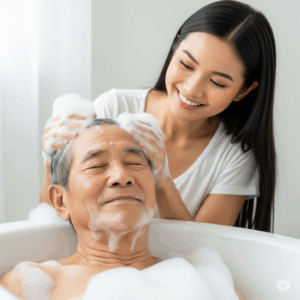 シャワー▶泡泡洗体▶指圧▶アロマオイルリンパマッサージ▶シャワー